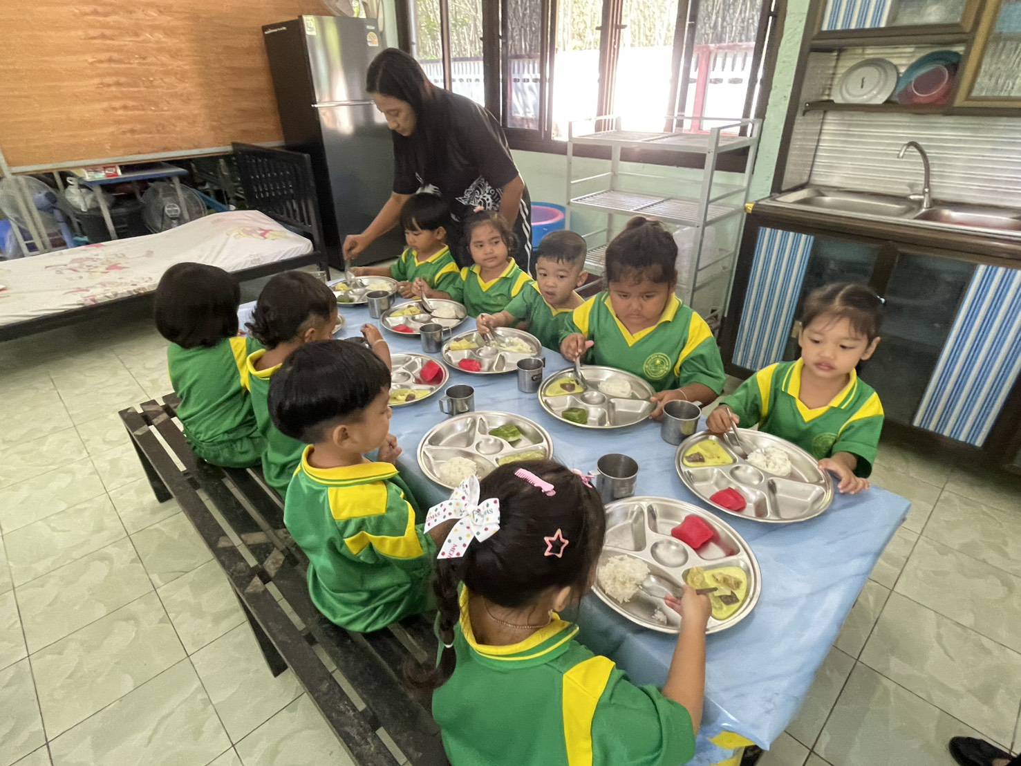 คณะกรรมการตรวจสอบคุณภาพอาหารกลางวันในสถานศึกษาองค์การบริหารส่วนตำบลควนกรด ดำเนินการติดตามโครงการอาหารกลางวัน ศูนย์พัฒนาเด็กเล็กบ้านวัดใหม่ นายจรูญ รัต...